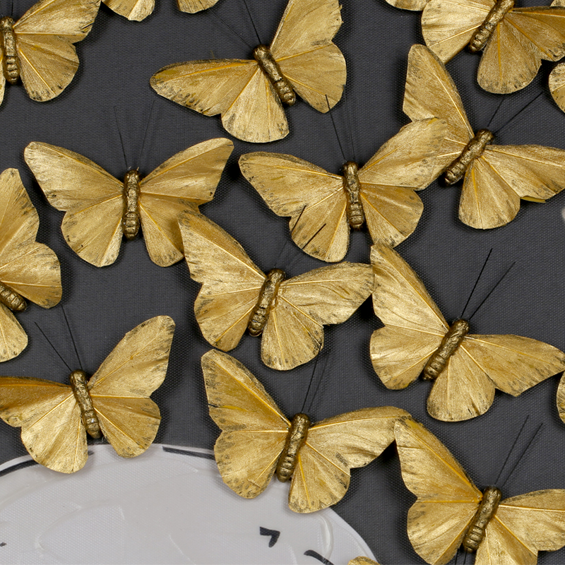 - Product Craftsmanship Product Craftsmanship: MDF backboard, 3D butterflies in the center with a gold foil effect, butterflies made of feathers, hand-painted textured background, Front acrylic glass panel
