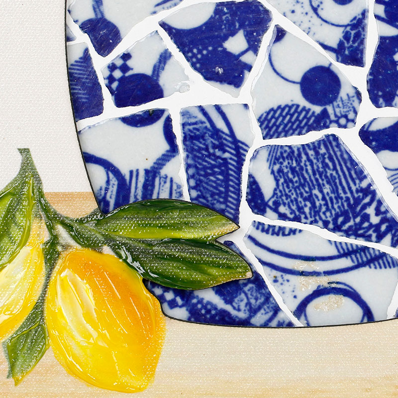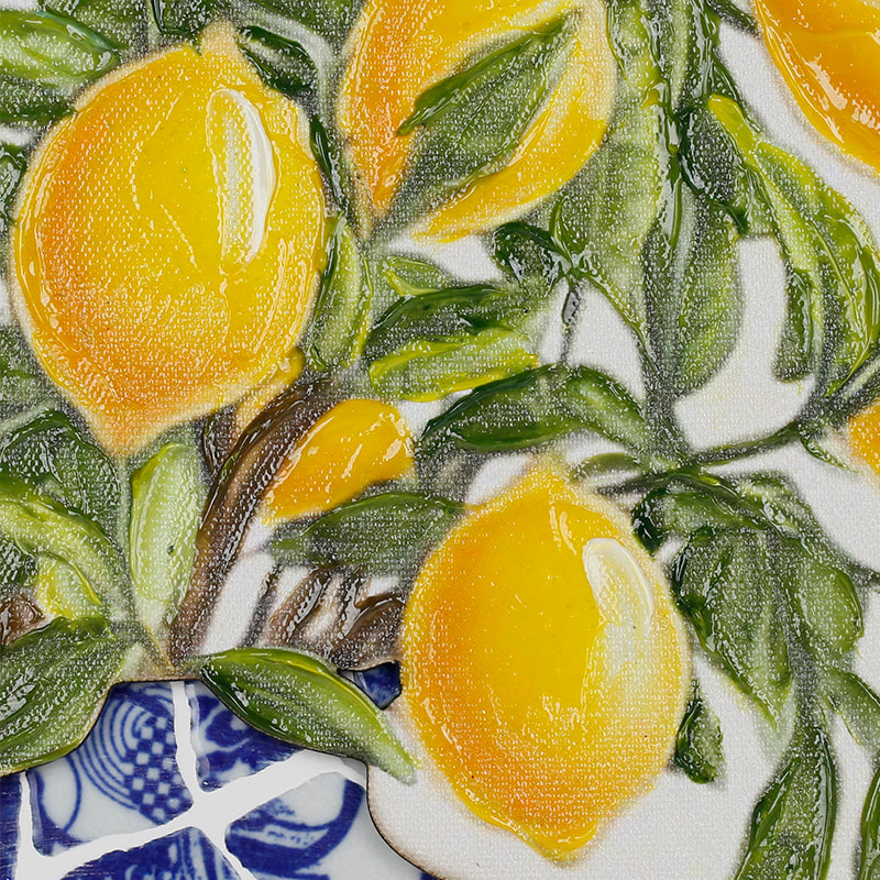 Product craftsmanship: MDF backboard, oil canvas base, pattern with thick hand-painted texture, vase pattern made with spliced blue and white porcelain pieces