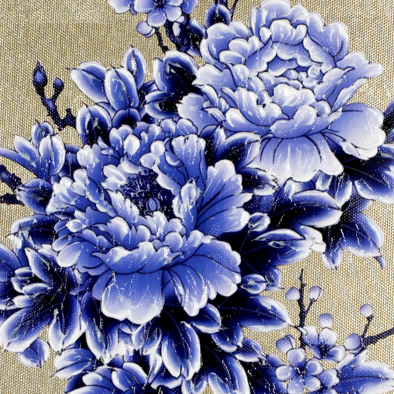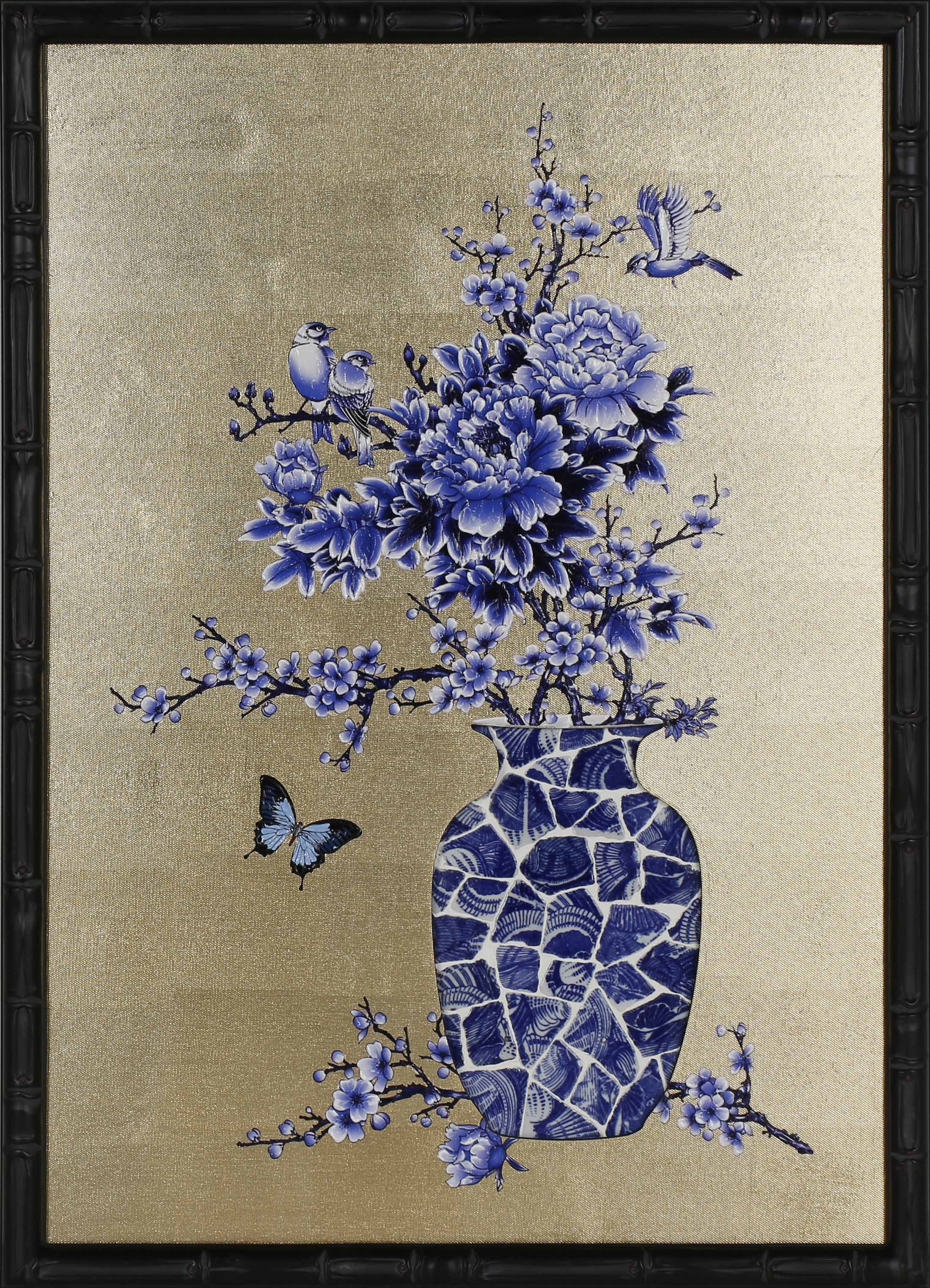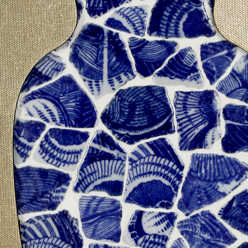 Product Craftsmanship: MDF backboard with gold foil canvas base,Hand-painted textured artwork, Vase motif composed of blue and white porcelain fragments