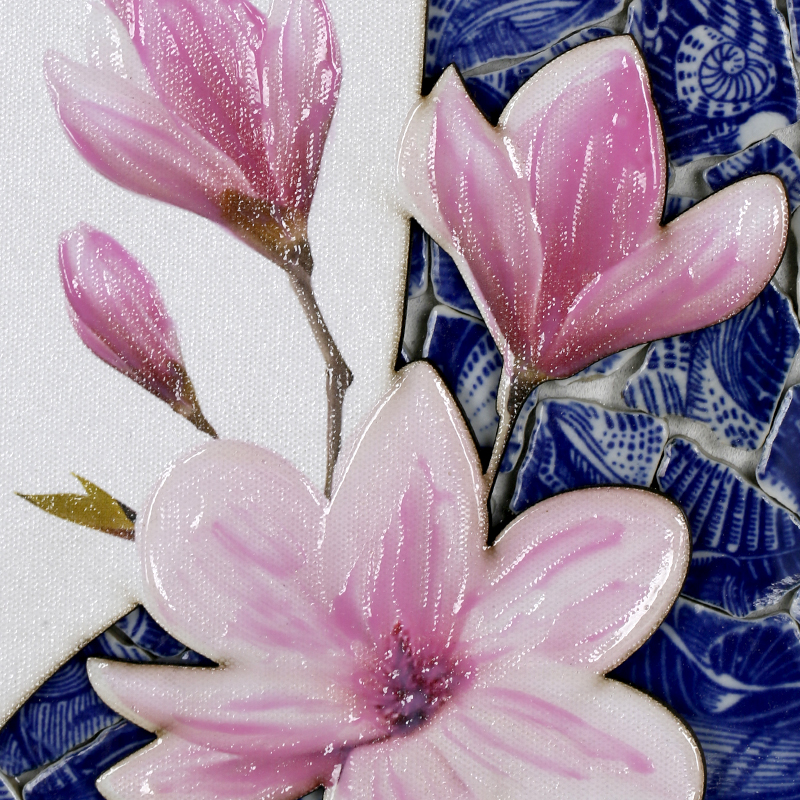 Product craftsmanship: MDF backboard, oil canvas base, pattern with hand-painted texture, vase pattern made with spliced blue and white porcelain pieces