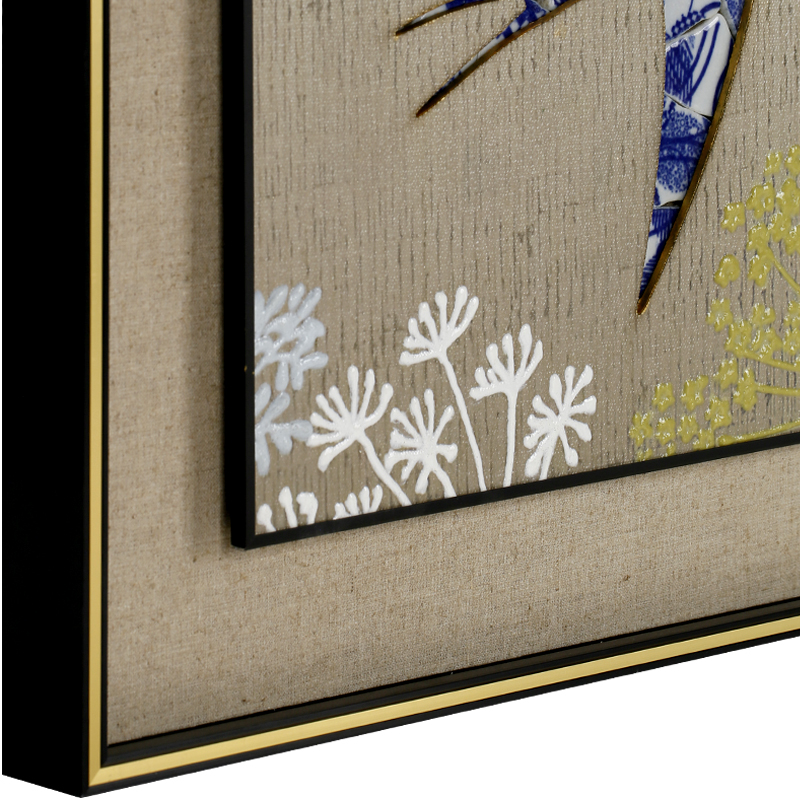 - Product Craftsmanship Product craftsmanship: MDF backboard, double-layer mounting with linen as the base layer, artwork center featuring hand-painted texture with a relief effect, bird pattern made with spliced blue and white porcelain pieces