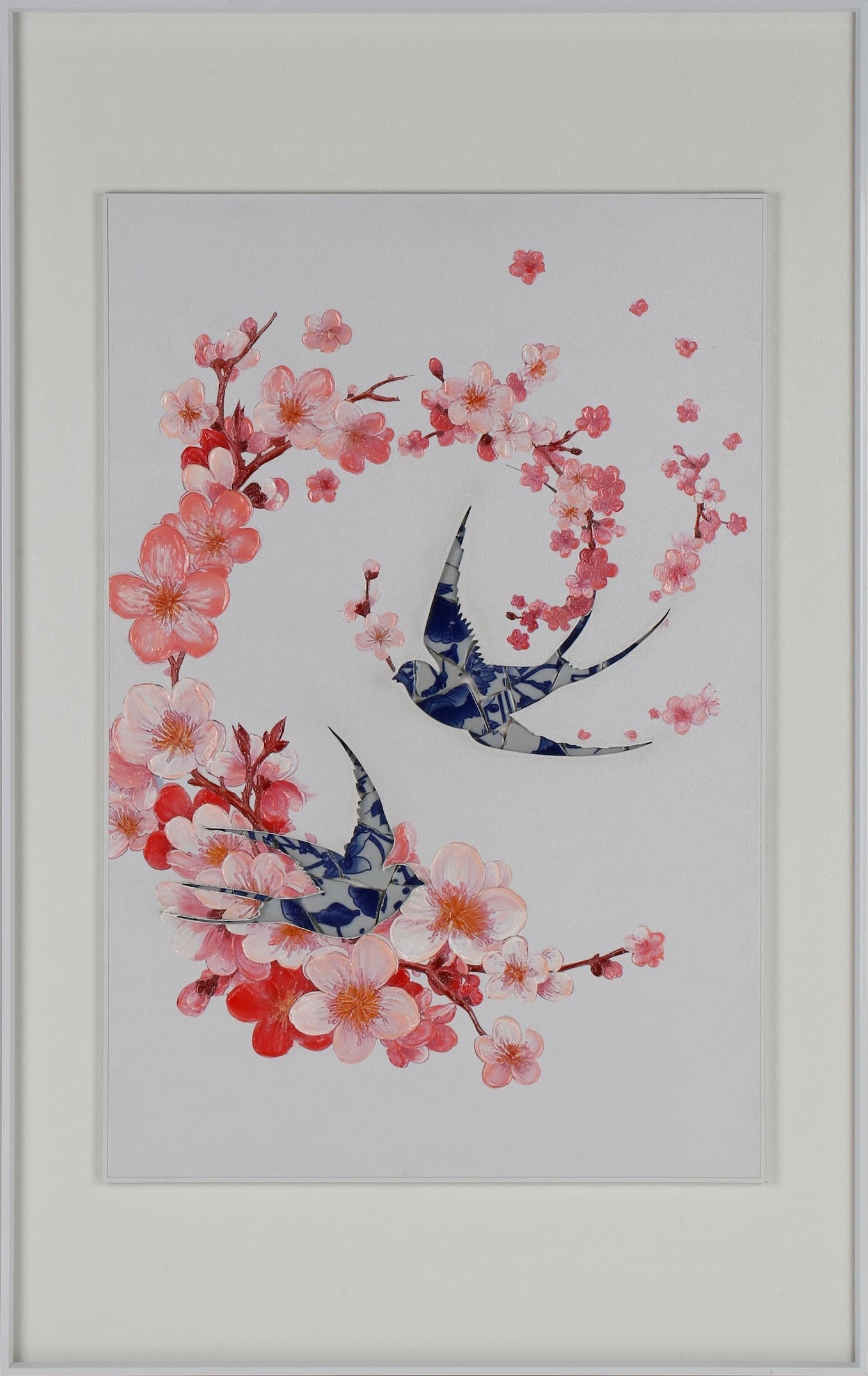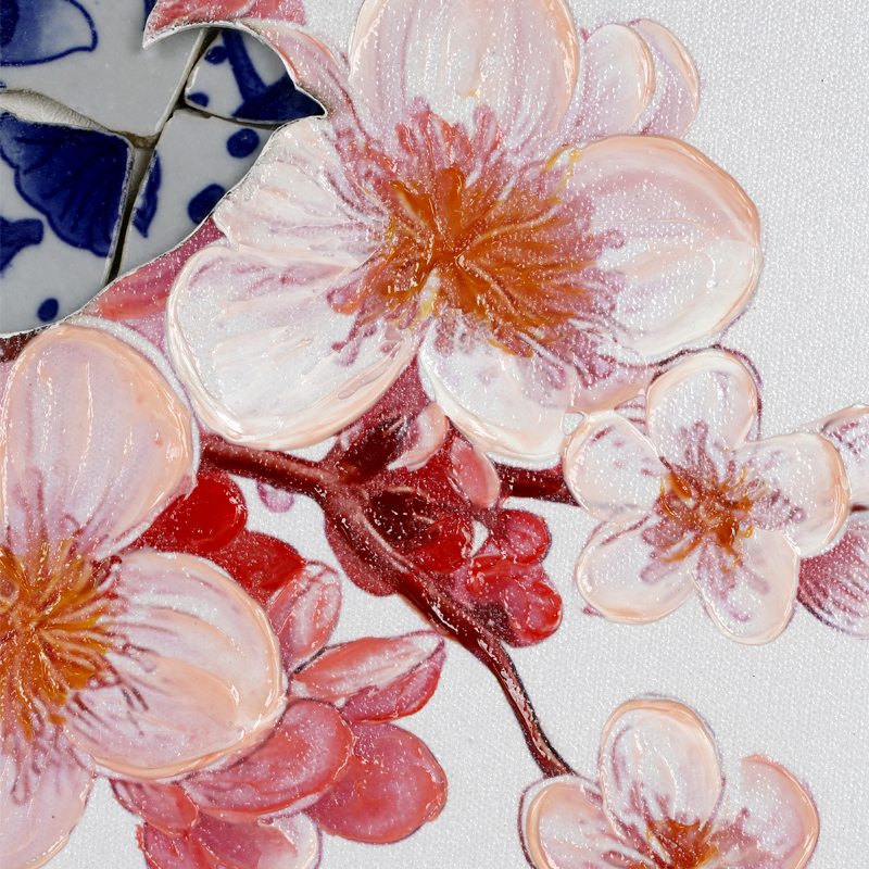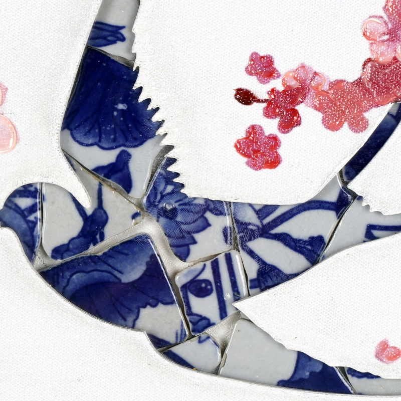 Product craftsmanship: MDF backboard, art paper base layer, artwork center with hand-painted texture, bird pattern made with spliced blue and white porcelain pieces