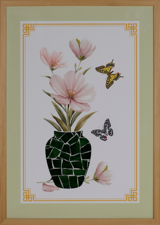 Product craftsmanship: MDF backboard, printed artwork center, vase pattern made with spliced acrylic pieces