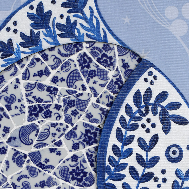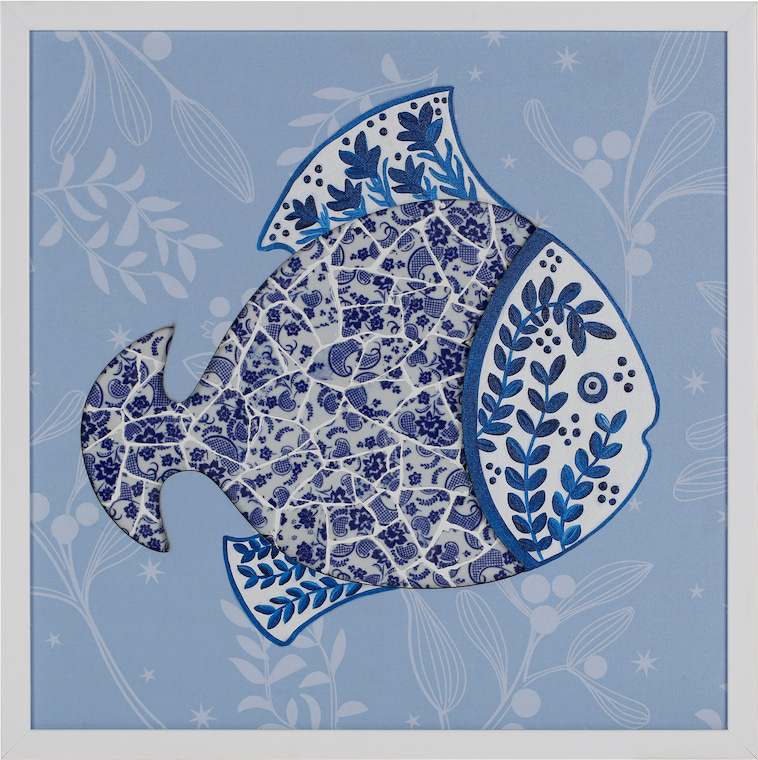 Product craftsmanship: MDF backboard, printed base layer pattern, partial hand-painted texture, fish pattern made with spliced blue and white porcelain pieces