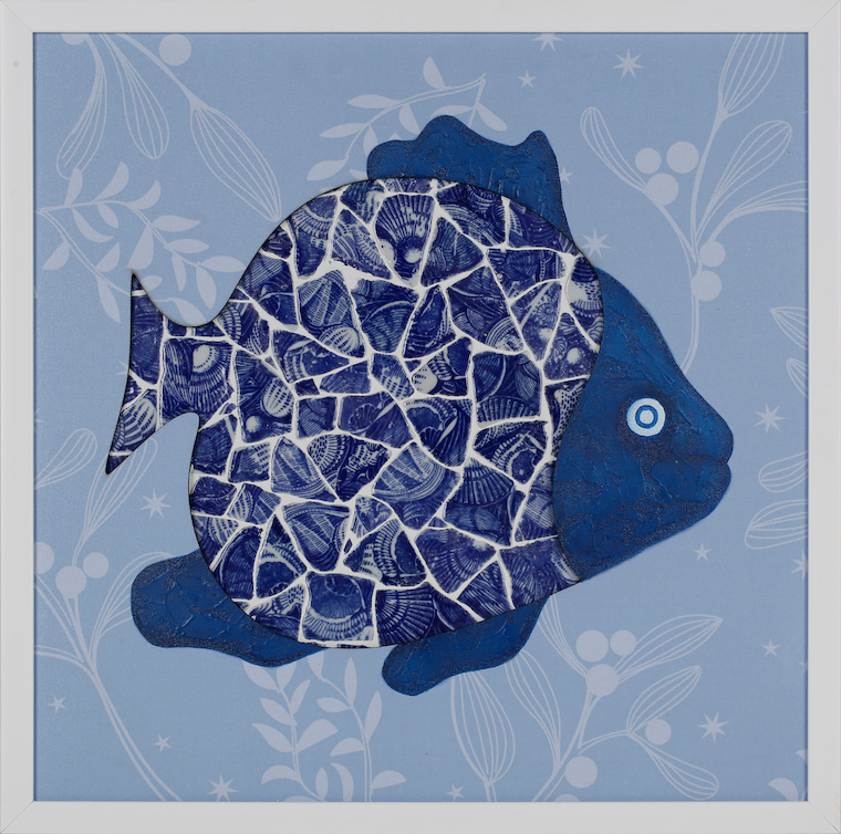 Product craftsmanship: MDF backboard, printed base layer pattern, partial hand-painted texture, fish pattern made with spliced blue and white porcelain pieces