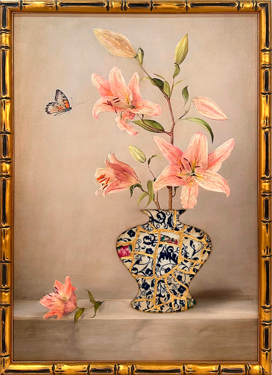 - Product Craftsmanship Product craftsmanship: MDF backboard, oil canvas base, pattern with hand-painted texture, vase pattern made with spliced blue and white porcelain pieces,The seams are filled with gold foil