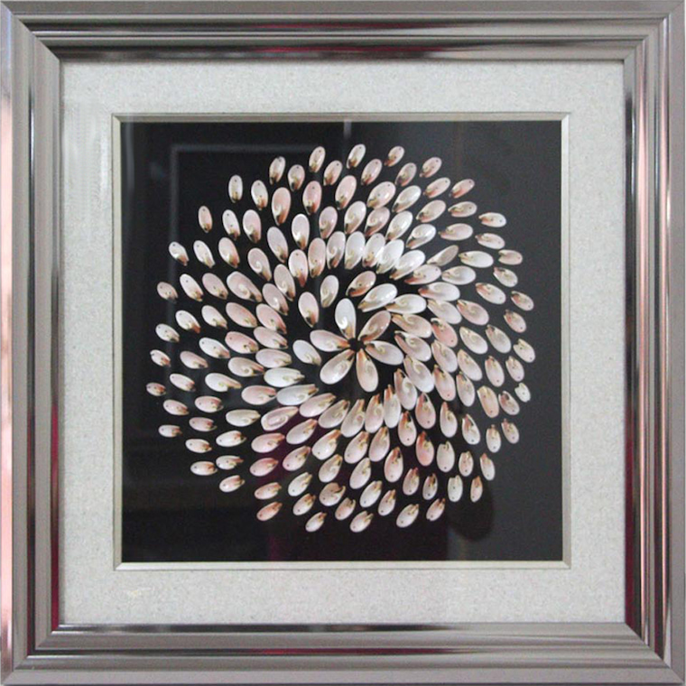 Product craftsmanship: MDF backboard, artwork center adorned with natural shell inlays, front covered with acrylic panel