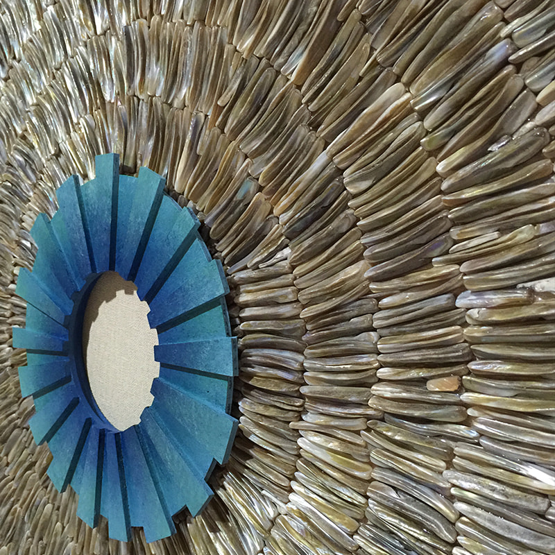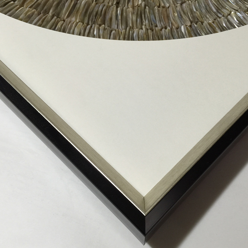 Product craftsmanship: MDF backboard, artwork center adorned with natural shell inlays, front covered with acrylic panel