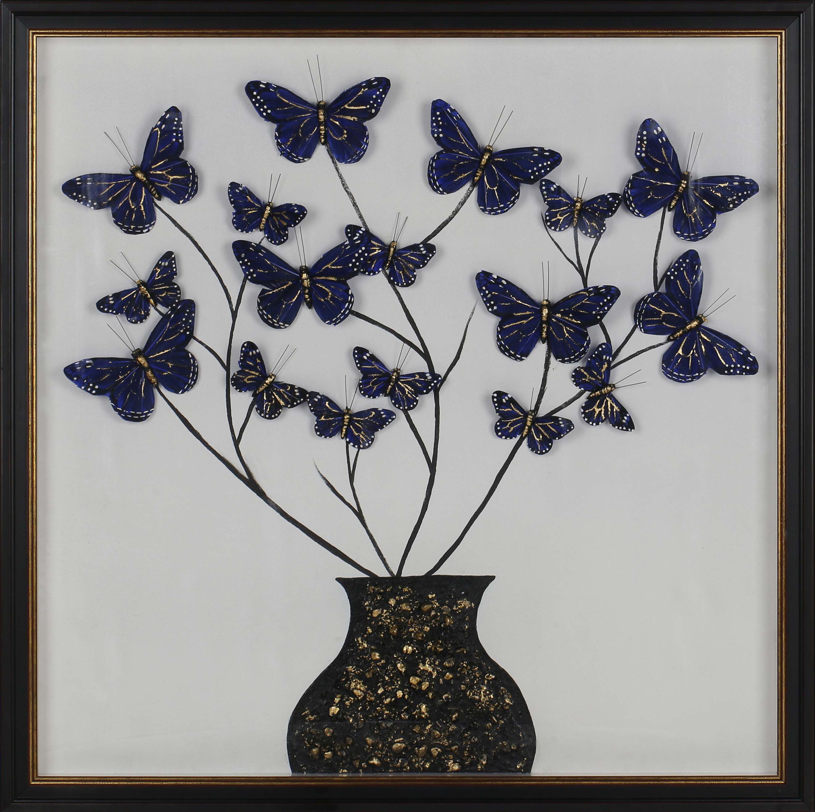 Product Craftsmanship: MDF backboard, 3D butterfly in the center made of dyed feathers, Vase and branches are hand-painted textures, acrylic glass on the front