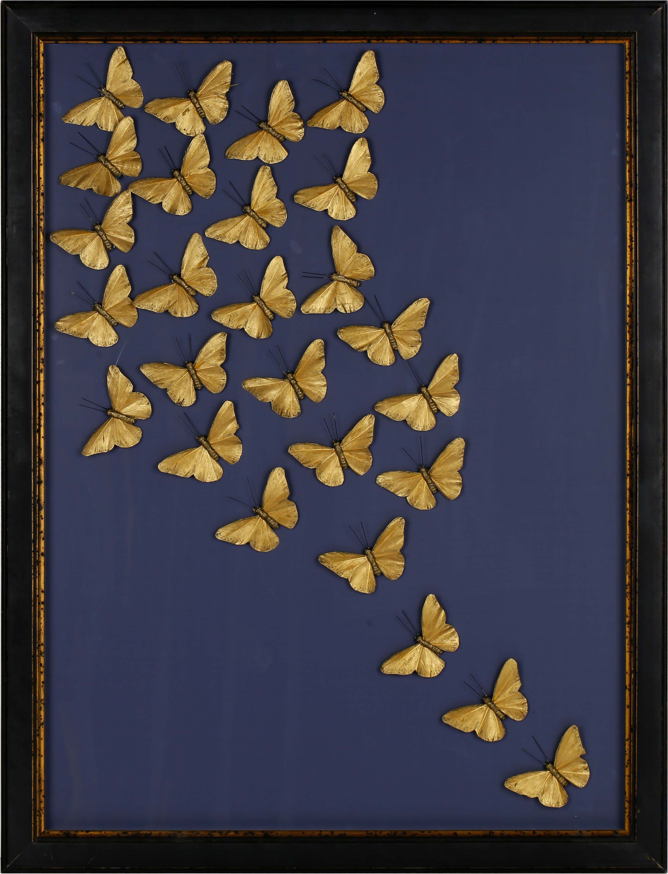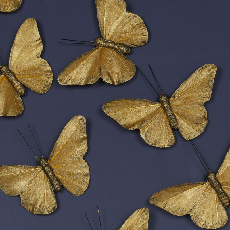 Product Craftsmanship: MDF backboard, 3D butterflies in the center with a gold foil effect, butterflies made of feathers, Front acrylic glass panel