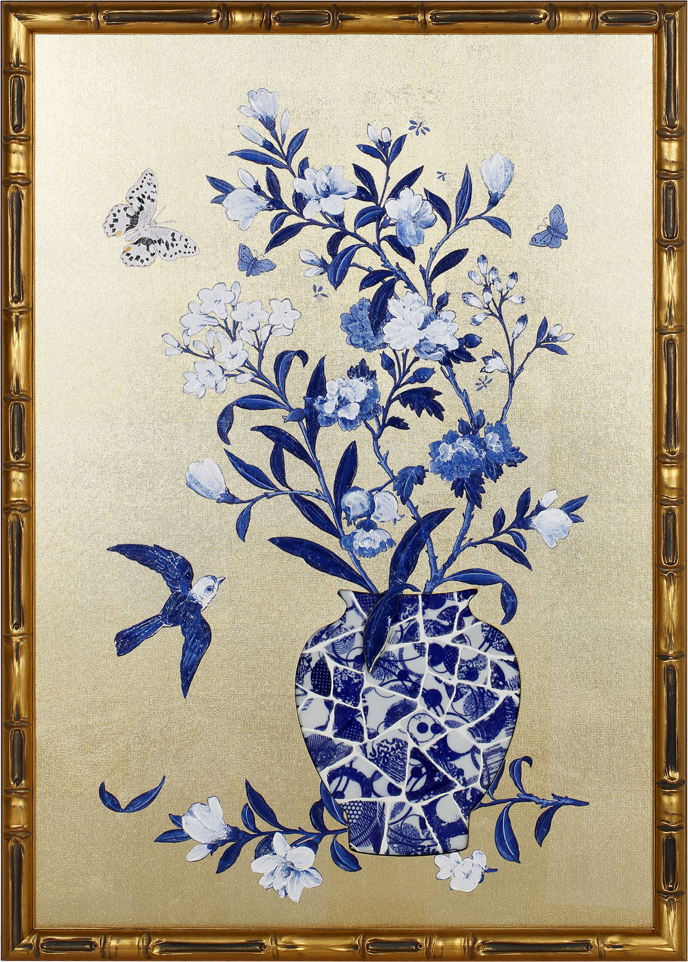 MDF backboard with gold foil canvas base,Hand-painted textured artwork, Vase motif composed of blue and white porcelain fragments